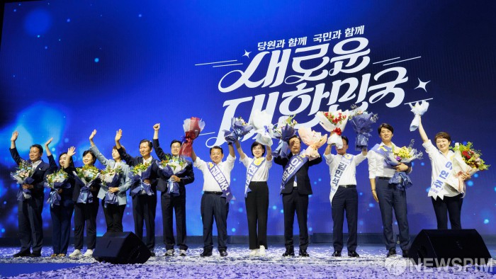 [서울=뉴스핌] 윤창빈 기자 = 18일 오후 서울 송파구 올림픽공원 KSPO돔에서 열린 더불어민주당 제1차 정기전국당원대회에서 이재명 신임 당대표를 비롯한 신임 최고위원들이 당선을 축하하며 인사하고 있다. 2024.08.18 pangbin@newspim.com