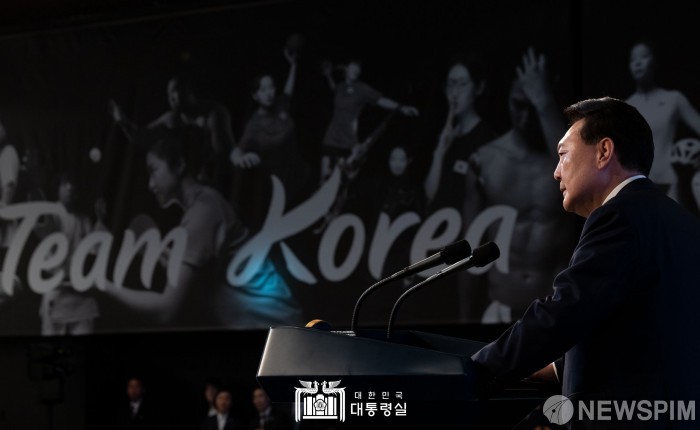 [서울=뉴스핌] 윤석열 대통령이 22일 서울 한 호텔에서 열린 2024 파리올림픽 선수단 격려 행사에서 격려사를 하고 있다. [사진=대통령실] 2024.08.23 photo@newspim.com