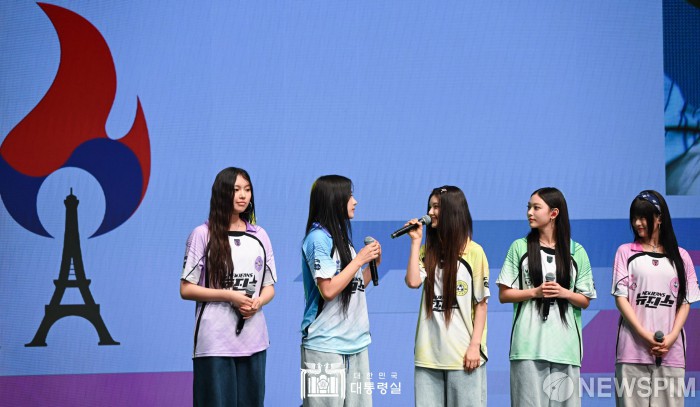 [서울=뉴스핌] 뉴진스가 22일 서울 한 호텔에서 열린 2024 파리올림픽 선수단 격려 행사에서 축하공연을 하며 발언하고 있다.[사진=대통령실] 2024.08.23 photo@newspim.com
