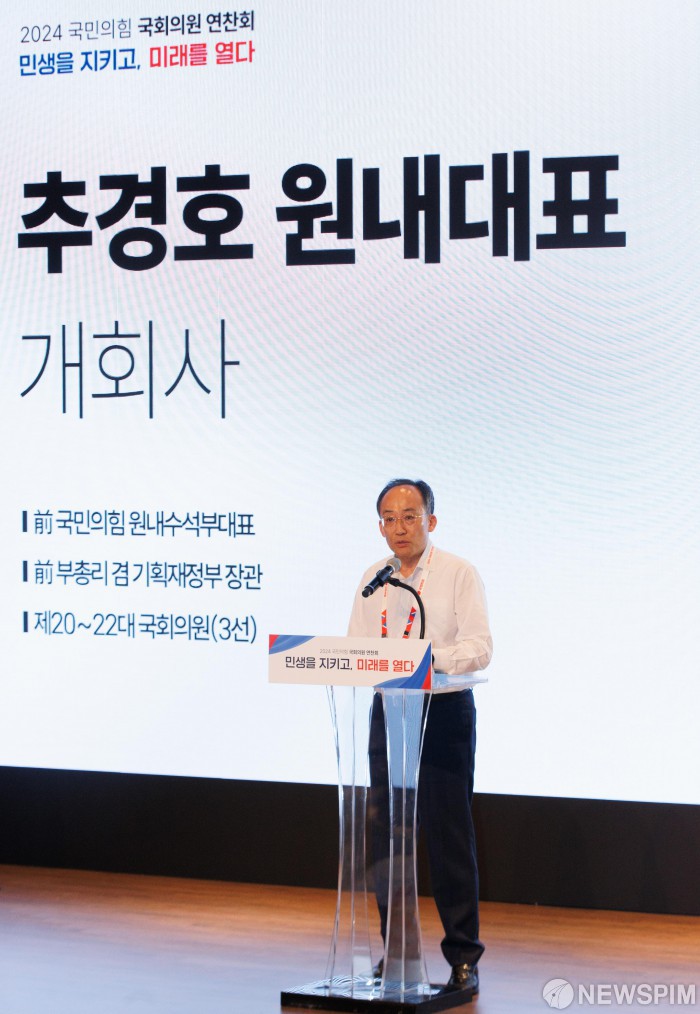 [인천=뉴스핌] 윤창빈 기자 = 추경호 국민의힘 원내대표가 29일 오후 인천 중구 인천국제공항공사 인재개발원에서 열린 2024 국민의힘 국회의원 연찬회에서 개회사를 하고 있다. 2024.08.29 pangbin@newspim.com