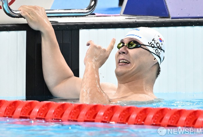 [서울=뉴스핌] 사진공동취재단 =조기성이 29일(현지시간) 프랑스 낭테르 라 데팡스 아레나에서 열린 2024 파리 패럴림픽 평영 50m(SB3등급) 결선에서 역영을 마치고 기록을 확인한 뒤 아쉬워하고 있다. 2024.08.29 photo@newspim.com