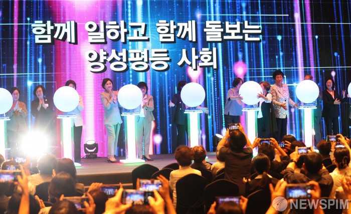 [서울=뉴스핌] 이호형 기자 = 신영숙 여성가족부 차관이 2일 오후 서울 서초구 양재 aT센터에서 열린 2024년 양성평등주간 기념식에서 양성평등 문화 확산 유공자 등 참석자들과 기념 세레모니를 하고 있다. 2024.09.02 leemario@newspim.com