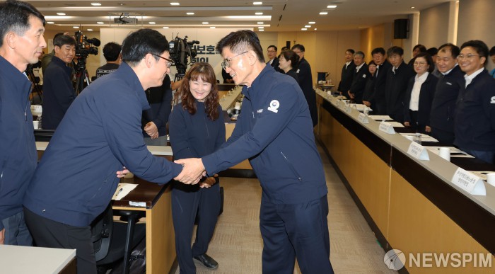 [서울=뉴스핌] 양윤모 기자 = 김문수 고용노동부 장관이 5일 오전 추석을 앞두고 서울고용노동청에서 개최된 '임금체불 근절과 약자보호를 위한 전국 기관장 회의'에 참석하며 자리를 직접 찾아가며 악수를 하고 있다. 2024.09.05 yym58@newspim.com
