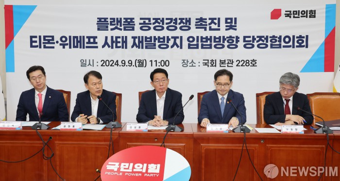 [서울=뉴스핌] 이형석 기자 = 윤한홍 정무위원장(왼쪽 두 번째)이 9일 오전 서울 여의도 국회에서 열린 플랫폼 공정경쟁 촉진 및 티몬·위메프사태 재발방지 입법방향 당정협의회에서 모두발언을 하고 있다. 2024.09.09 leehs@newspim.com