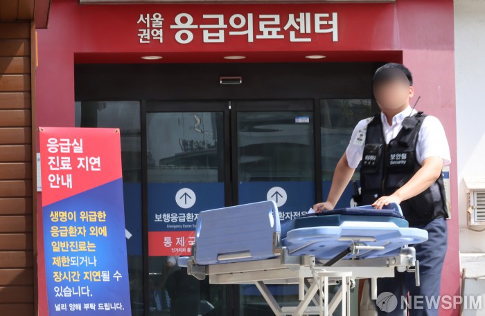 [서울=뉴스핌] 양윤모 기자 = 11일 오후 서울의 대학 병원 응급의료센터 관계자가 환자 이동용 침상을 옮기고 있다.정부는 추석 연휴에 응급실 환자가 몰리는 상황에 대비해 11일부터 25일까지 2주간 '추석 명절 비상 응급 대응 주간'을 운영한다. 2024.09.11 yym58@newspim.com