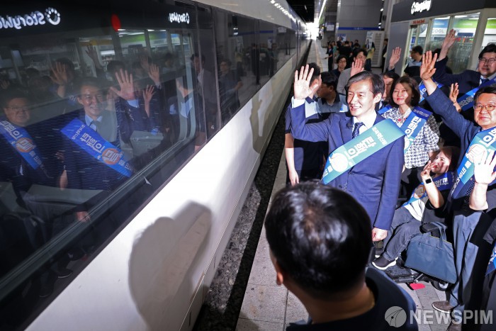 [서울=뉴스핌] 이형석 기자 = 조국 조국혁신당 대표와 의원들이 13일 오전 서울 용산역에서 추석을 맞아 고향으로 떠나는 시민들을 향해 인사를 하고 있다. 2024.09.13 leehs@newspim.com