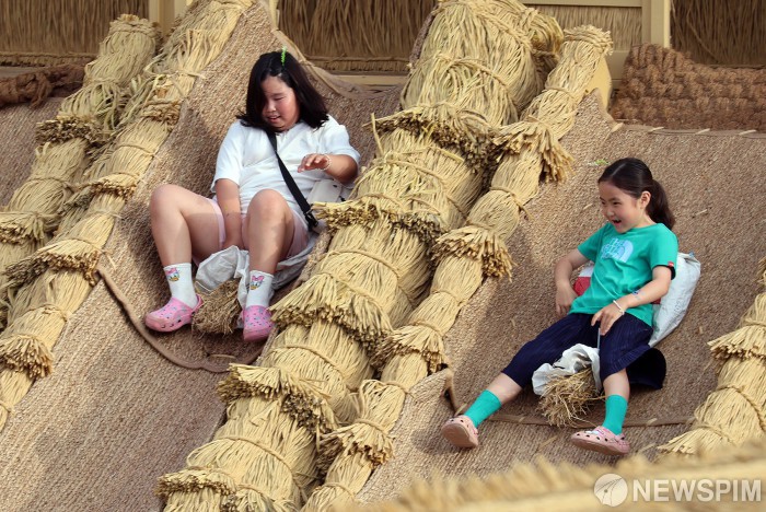 [서울=뉴스핌] 민족 최대 명절 추석 연휴 둘째 날인 15일, 추석 연휴를 맞아 평창군 봉평면 이효석문화마을 일원에서 열린 '2024 평창 효석문화제'를 찾은 찾은 어린이들이 짚으로 만든 미끄럼을 즐기고 있다. [사진=평창군청] 2024.09.15 yym58@newspim.com