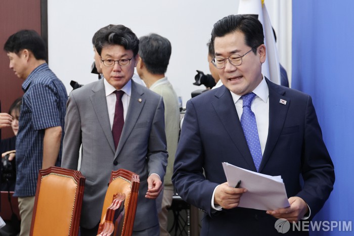 [서울=뉴스핌] 이형석 기자 = 박찬대 더불어민주당 원내대표가 19일 오전 서울 여의도 국회에서 열린 정책조정회의에 참석하고 있다. 2024.09.19 leehs@newspim.com