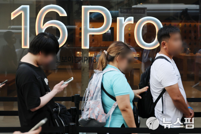 [서울=뉴스핌] 이형석 기자 = 20일 서울 중구 명동 애플스토어에서 고객들이 애플 신제품 아이폰16 시리즈를 구매하기 위해 줄을 서 있다. 2024.09.20 leehs@newspim.com