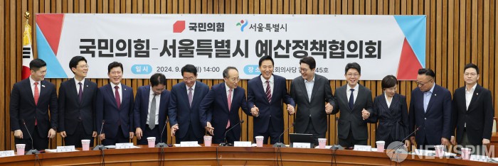 [서울=뉴스핌] 이형석 기자 = 추경호 국민의힘 원내대표와 오세훈 서울시장을 비롯한 참석자들이 23일 오후 서울 여의도 국회에서 열린 국민의힘 - 서울특별시 예산정책협의회에서 기념 촬영을 하고 있다. 2024.09.23 leehs@newspim.com