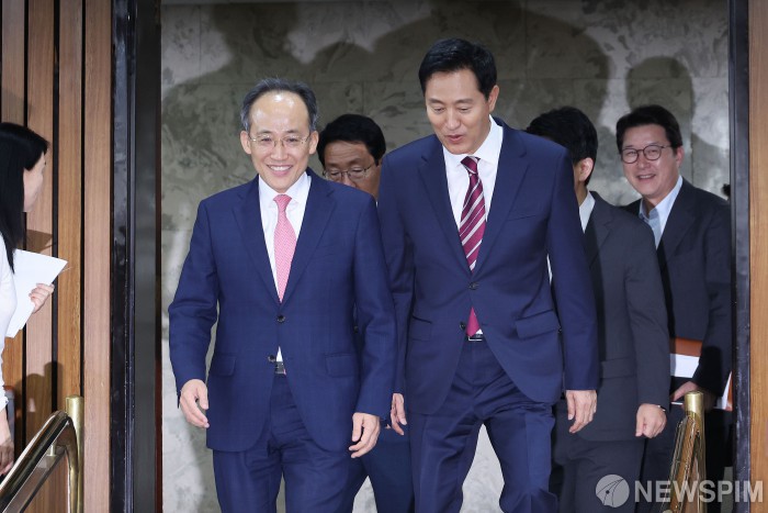 [서울=뉴스핌] 이형석 기자 = 추경호 국민의힘 원내대표(왼쪽)와 오세훈 서울시장이 23일 오후 서울 여의도 국회에서 열린 국민의힘 - 서울특별시 예산정책협의회에 참석하고 있다. 2024.09.23 leehs@newspim.com