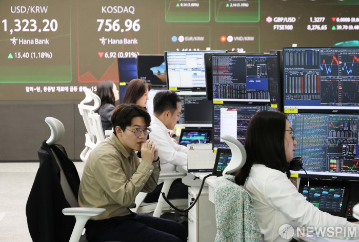 [서울=뉴스핌] 양윤모 기자 = 뉴욕 증시가 이란의 이스라엘 공격 소식으로 하락세로 마감한 가운데, 2일 오전 9시 코스피지수는 전 거래일 종가보다 28.37포인트(-1.09%) 하락한 2,564.90으로, 코스닥지수는 7.79포인트(-1.02%) 하락한 756.09로 10월의 첫 장을 시작했다. 서울 외환시장에서 달러/원 환율은 전날 대비 15.00원(1.15%) 상승한 1,322.80원에 오전 거래를 시작한 가운데, 서울 중구 하나은행 딜링룸에서 직원들이 업무를 보고 있다. 2024.10.02 yym58@newspim.com
