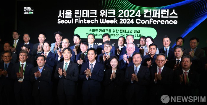 [서울=뉴스핌] 이호형 기자 = 오세훈 서울시장과 이복현 금융감독원장이 8일 오전 서울 여의도 콘래드호텔에서 열린 서울 핀테크 위크 2024 컨퍼런스에서 참석자들과 기념촬영을 하고 있다. 2024.10.08 leemario@newspim.com
