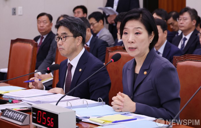 [서울=뉴스핌] 이형석 기자 = 오영주 중소벤처기업부 장관이 8일 오전 서울 여의도 국회에서 열린 산업통상자원중소벤처기업위원회의 중소벤처기업부, 특허청, 한국발명진흥회, 한국지식재산연구원, 한국지식재산보호원 등 국정감사에서 질의에 답하고 있다. 2024.10.08 leehs@newspim.com
