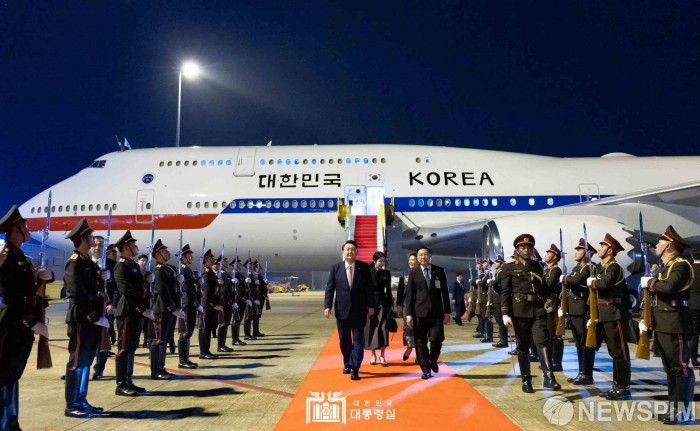 [서울=뉴스핌] 윤석열 대통령과 부인 김건희 여사가 9일(현지시간) 라오스 비엔티안 왓타이 국제공항에 도착해 차량으로 이동하고 있다.[사진=대통령실 ] 2024.10.10 photo@newspim.com