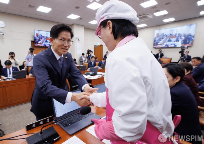 [서울=뉴스핌] 윤창빈 기자 = 김문수 고용노동부 장관이 10일 오전 서울 여의도 국회에서 열린 환경노동위원회의 고용노동부에 대한 국정감사에서 급식노동자 복장을 한 정혜경 진보당 의원과 인사하고 있다. 2024.10.10 pangbin@newspim.com