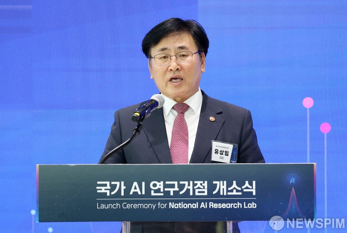 [서울=뉴스핌] 정일구 기자 = 유상임 과학기술정보통신부 장관이 28일 오후 서울 서초구 서울 AI 허브에서 열린 국가 AI 연구거점 개소식에서 축사를 하고 있다. 2024.10.28 mironj19@newspim.com