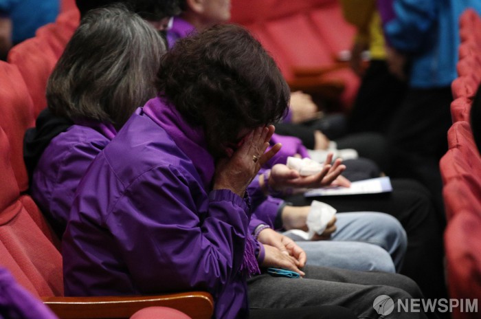 [서울=뉴스핌] 윤창빈 기자 = 29일 국회에서 열린 10·29 이태원참사 2주기 추모식에서 유가족들이 눈물을 흘리고 있다. 2024.10.29 pangbin@newspim.com