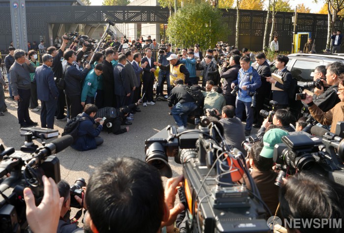 [파주=뉴스핌] 최지환 기자 = 대북전단 살포를 예고한 최성용 납북자가족모임 대표(오른쪽)가 31일 오전 경기 파주시 임진각 국립 6·25전쟁 납북자 기념관에서 대북 전단 살포 중단을 요구하는 김경일 파주시장을 비롯한 관계자와 논쟁을 벌이고 있다. 납북자가족모임은 경기도 특별사법경찰과 경찰, 접경지역 주민들의 반대에 이날 예고한 대북전단 살포를 취소했다. 2024.10.31 choipix16@newspim.com