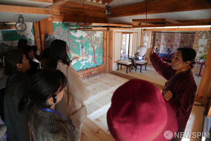 [서울=뉴스핌] 최지환 기자 = 7일 서울 종로구 경복궁에서 열린 ‘조선의 빛과 그림자: 건청궁과 향원정에서의 특별한 산책’ 특별관람 관람객들이 건청궁을 살펴보고 있다. 1873년 지어진 건청궁은 고종과 명성황후가 머물렀던 공간으로 1895년 10월 명성황후가 시해됐던 공간이기도 하다. 2024.11.07 choipix16@newspim.com
