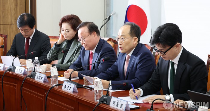 [서울=뉴스핌] 이형석 기자 = 추경호 국민의힘 원내대표가 11일 오전 서울 여의도 국회에서 열린 최고위원회의에서 모두발언을 하고 있다. 2024.11.11 leehs@newspim.com
