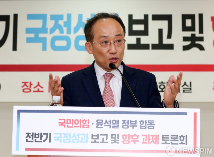 [서울=뉴스핌] 최지환 기자 = 추경호 국민의힘 원내대표가 11일 오후 여의도 국회에서 열린 국민의힘·윤석열 정부 합동 전반기 국정성과 보고 및 향후 과제 토론회에서 인사말을 하고 있다. 2024.11.11 choipix16@newspim.com