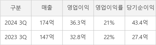 ◆ 3Q 실적, 매출액 174억원 전년동기 대비 19% 증가... 영업이익 11% 증가
