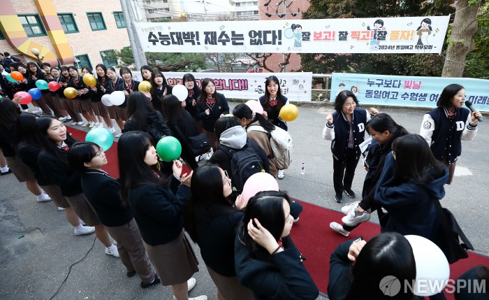 [서울=뉴스핌] 정일구 기자 = 2025학년도 대학수학능력시험을 하루 앞둔 13일 오전 서울 금천구 동일여자고등학교에서 열린 장행식에서 고3 수험생들이 선생님과 재학생들의 응원을 받으며 교정을 나서고 있다. 2024.11.13 mironj19@newspim.com