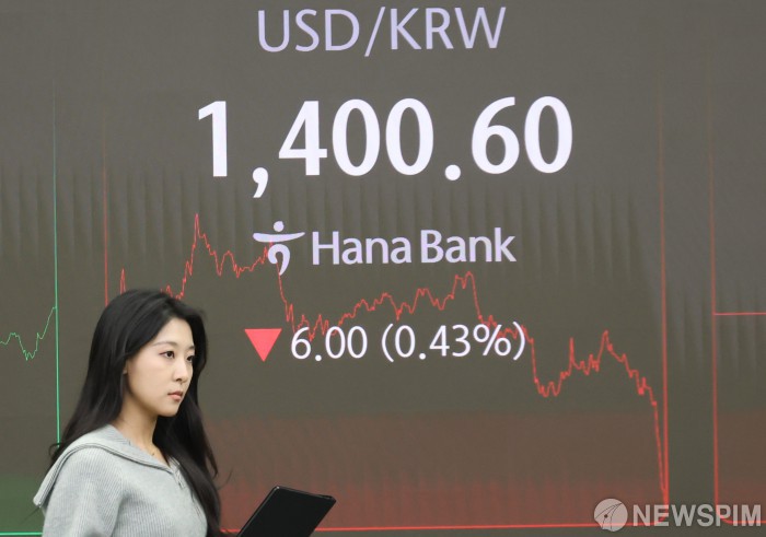 [서울=뉴스핌] 양윤모 기자 = 최상목 부총리겸 기획재정부 장관이 "금융·외환시장 변동성이 과도하면 적극적 시장 안정 조치를 시행하겠다"고 발언한 가운데, 14일 오후 4시30분 코스피 지수는 전일 종가보다 1.78포인트(0.07%) 상승한 2,418.86으로, 코스닥 지수는 8.09포인트(-1.17%) 하락한 681.56으로 오후 거래를 마감했다. 서울 외환시장에서 달러/원 환율은 전일보다 5.60원(-0.40%) 하락한 1,401.00원에 오후 거래를 마감하며, 서울 중구 하나은행 딜링룸에서 직원들이 업무를 보고 있다. 2024.11.14 yym58@newspim.com