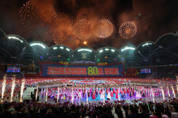 | 지난 10월 9일 북한 평양에서 열린 조선노동당 창건 80주년 기념 행사에서 예술가들이 공연을 선보이고 있다. [사진=스푸트니크/로이터 뉴스핌] |