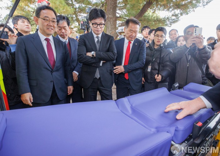 [서울=뉴스핌] 윤창빈 기자 = 한동훈 국민의힘 대표, 주호영 국회부의장 등 참석자들이 19일 오전 서울 여의도 국회 의원회관 앞 잔디마당에 전시된 한국형 구급차 2.0의 들것을 살펴보고 있다. 2024.11.19 pangbin@newspim.com