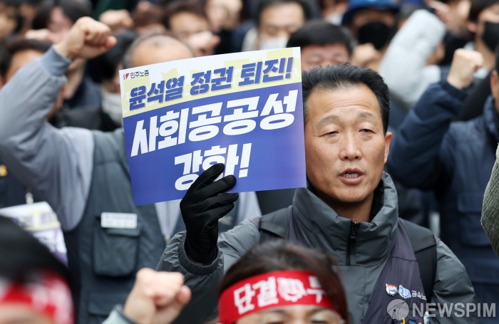 [서울=뉴스핌] 정일구 기자 = 20일 오후 서울 중구 서울지방고용노동청 앞에서 열린 노동기본권-사회공공성 쟁취 민주노총 결의대회에서 양경수 민주노총 위원장 등 참가자들이 구호를 외치고 있다. 2024.11.20 mironj19@newspim.com