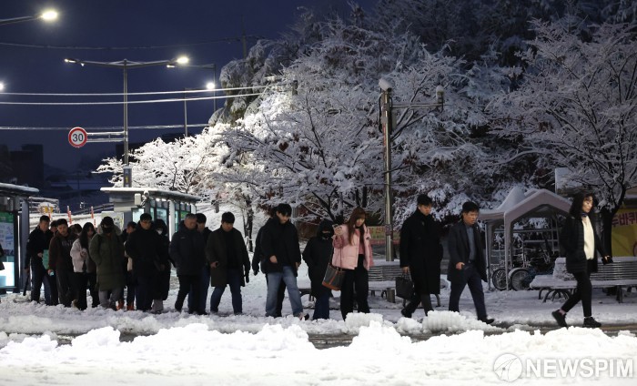 [인천=뉴스핌] 김학선 기자 = 밤새 폭설 수준으로 쏟아진 첫눈으로 서울과 수도권 대부분 지역에 대설주의보가 내려진 27일 오전 인천 계양역에서 시민들이 출근을 서두르고 있다. 2024.11.27 yooksa@newspim.com