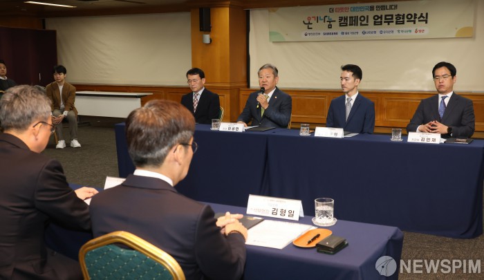 [서울=뉴스핌] 양윤모 기자 =이상민 행정안전부 장관이 27일 오전 은행회관에서 개최된 '온기나눔 캠페인 업무 협약식'에 참석하여 인사말을 하고 있다. 이자리에는 황도연 당근마켓 대표, 채원철 삼성전자 부사장, 정상혁 신한은행장, 이 장관, 이승열 하나은행장, 김형일 기업은행 수석부행장, 조한래 우리은행 부행장, 김민재 차관보가 참석 했다. 2024.11.27 yym58@newspim.com