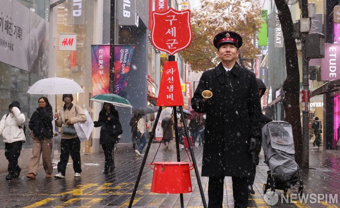 [서울=뉴스핌] 양윤모 기자 = 첫눈이 내린 27일 오후 서울 중구 명동에서 구세군 자선냄비 모금이 시작되었다. 2024.11.27 yym58@newspim.com