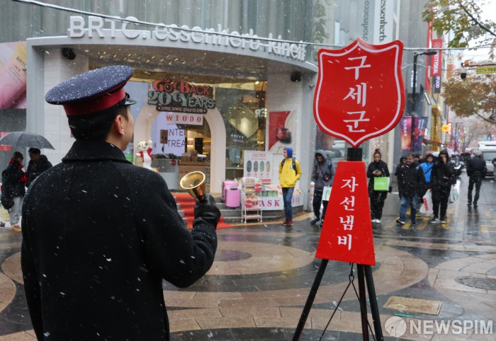 [서울=뉴스핌] 양윤모 기자 = 첫눈이 내린 27일 오후 서울 중구 명동에서 구세군 자선냄비 모금이 시작되었다. 2024.11.27 yym58@newspim.com