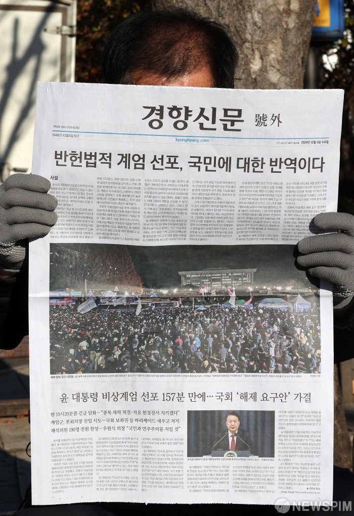[서울=뉴스핌] 정일구 기자 = 윤석열 대통령이 선포한 비상계엄이 국회의 해제 요구 결의안 통과로 6시간여 만에 해제된 4일 오전 서울 구로구 신도림역 인근에서 한 시민이 관련 내용으로 발행된 호외를 읽고 있다. 2024.12.04 mironj19@newspim.com
