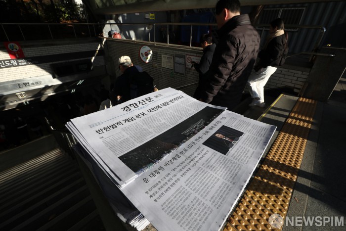 [서울=뉴스핌] 정일구 기자 = 윤석열 대통령이 선포한 비상계엄이 국회의 해제 요구 결의안 통과로 6시간여 만에 해제된 4일 오전 서울 구로구 신도림역 인근에 관련 내용으로 발행된 호외가 놓여 있다. 2024.12.04 mironj19@newspim.com