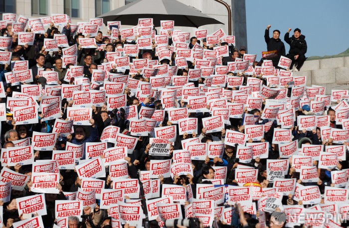 [서울=뉴스핌] 윤창빈 기자 = 4일 오후 서울 여의도 국회에서 열린 윤석열 대통령 사퇴촉구 탄핵추진 비상시국대회에서 더불어민주당, 조국혁신당 등 야당과 시민사회단체 참석자들이 구호를 외치고 있다. 2024.12.04 pangbin@newspim.com