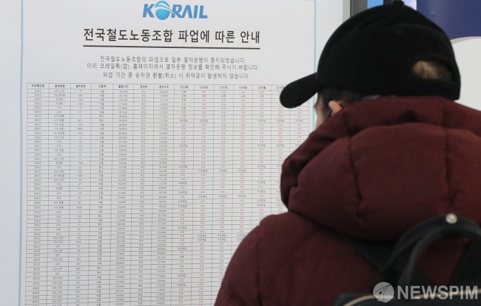 [서울=뉴스핌] 최지환 기자 = 전국철도노동조합이 총파업에 돌입한 5일 오전 서울 용산구 서울역에 파업 관련 안내문이 게시되어 있다. 2024.12.05 choipix16@newspim.com