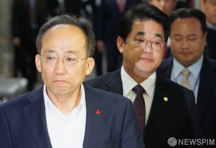 [서울=뉴스핌] 윤창빈 기자 = 추경호 국민의힘 원내대표, 배준영 원내수석부대표가 6일 오전 서울 여의도 국회에서 열린 긴급최고위원회의에 참석하고 있다. 2024.12.06 pangbin@newspim.com