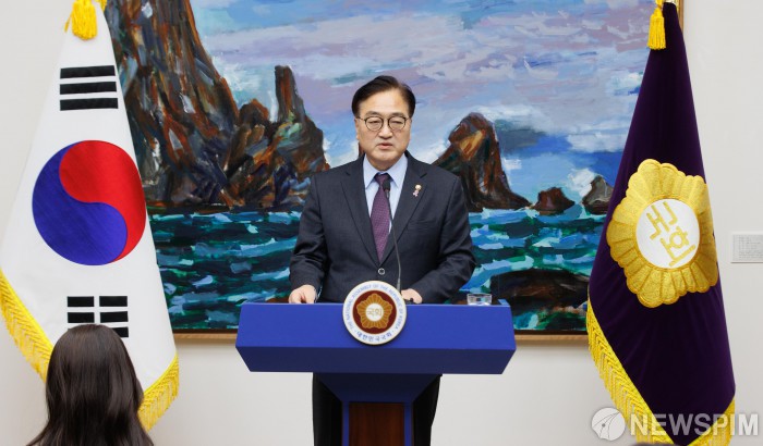 [서울=뉴스핌] 윤창빈 기자 = 우원식 국회의장이 6일 오후 서울 여의도 국회 의장접견실에서 긴급 담화를 발표를 하고 있다. 2024.12.06 pangbin@newspim.com