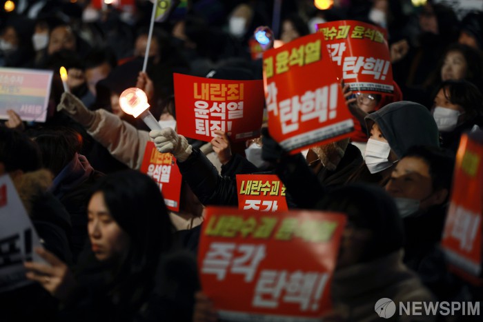 [서울=뉴스핌] 이형석 기자 = 6일 밤 서울 여의도 국회의사당 인근에서 윤석열 대통령 탄핵 촉구 집회가 열리고 있다. 2024.12.06 leehs@newspim.com