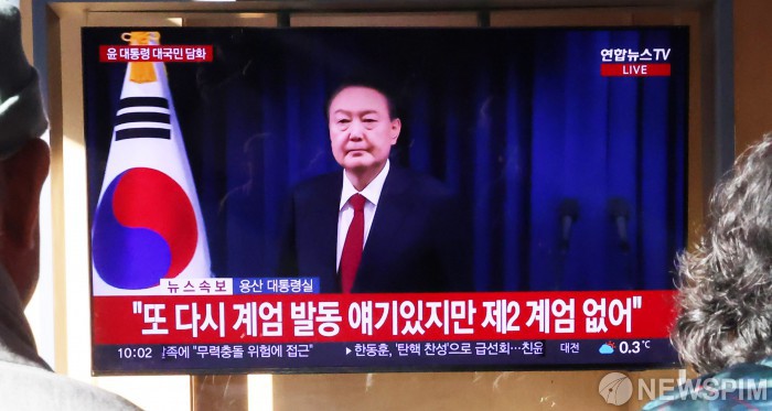 [서울=뉴스핌] 양윤모 기자 = 7일 오전 서울역을 찾은 시민들이 윤석열 대통령 탄핵소추와 '김건희 특검법' 재표결을 앞두고 방송되고 있는 윤 대통령의 '계엄 사태'에 관한 사과 입장 발표 방송을 시청하고 있다. 2024.12.07 yym58@newspim.com
