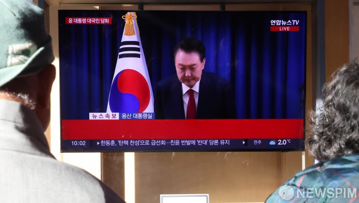 [서울=뉴스핌] 양윤모 기자 = 7일 오전 서울역을 찾은 시민들이 윤석열 대통령 탄핵소추와 '김건희 특검법' 재표결을 앞두고 방송되고 있는 윤 대통령의 '계엄 사태'에 관한 사과 입장 발표 방송을 시청하고 있다. 2024.12.07 yym58@newspim.com
