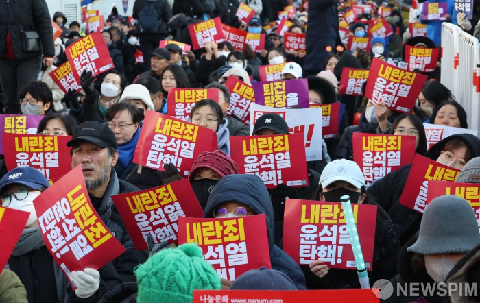 [서울=뉴스핌] 양윤모 기자 = 윤석열 대통령 탄핵소추와 '김건희 특검법' 재표결을 앞둔 7일 오후 여의도 국회 앞에서 윤 대통령 탄핵을 촉구하는 ‘내란죄 윤석열 퇴진! 국민주권 실현! 사회대개혁! 범국민 촛불 대행진’ 집회가 열리고 있다. 2024.12.07 yym58@newspim.com