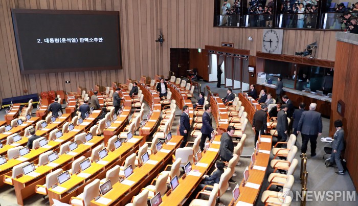 [서울=뉴스핌] 이형석 기자 = 7일 오후 서울 여의도 국회에서 열린 제418회 국회(정기회) 제17차 본회의에서 윤석열 대통령 탄핵소추안이 상정되자 국민의힘 의원들이 퇴장하고 있다. 2024.12.07 leehs@newspim.com