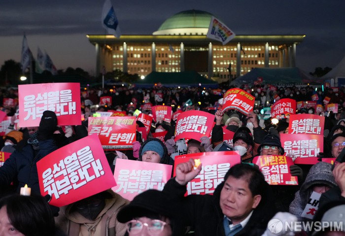 [서울=뉴스핌] 최지환 기자 = 7일 오후 서울 여의도 국회 앞에서 시민들이 윤석열 대통령 탄핵을 요구하며 시위를 하고 있다. 2024.12.07 choipix16@newspim.com