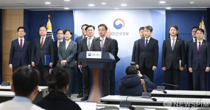 [서울=뉴스핌] 이호형 기자 = 최상목 경제부총리 겸 기획재정부 장관을 비롯한 국무위원들이 8일 오후 서울 종로구 정부서울청사에서 브리핑룸에서 관계부처 합동 성명문 '국민께 드리는 말씀'을 낭독하고 있다. 2024.12.08 leemario@newspim.com