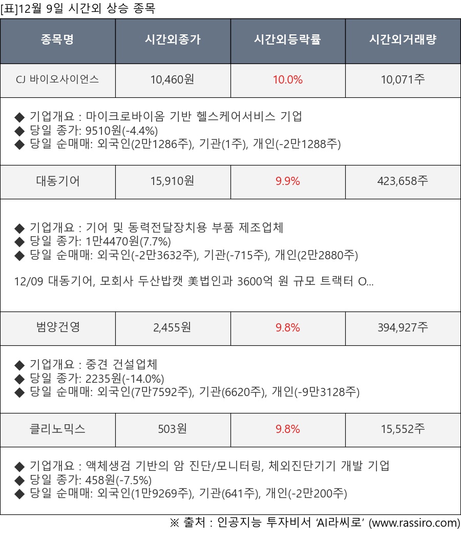 ※ 관련 종목: CJ 바이오사이언스, 대동기어, 범양건영, 클리노믹스